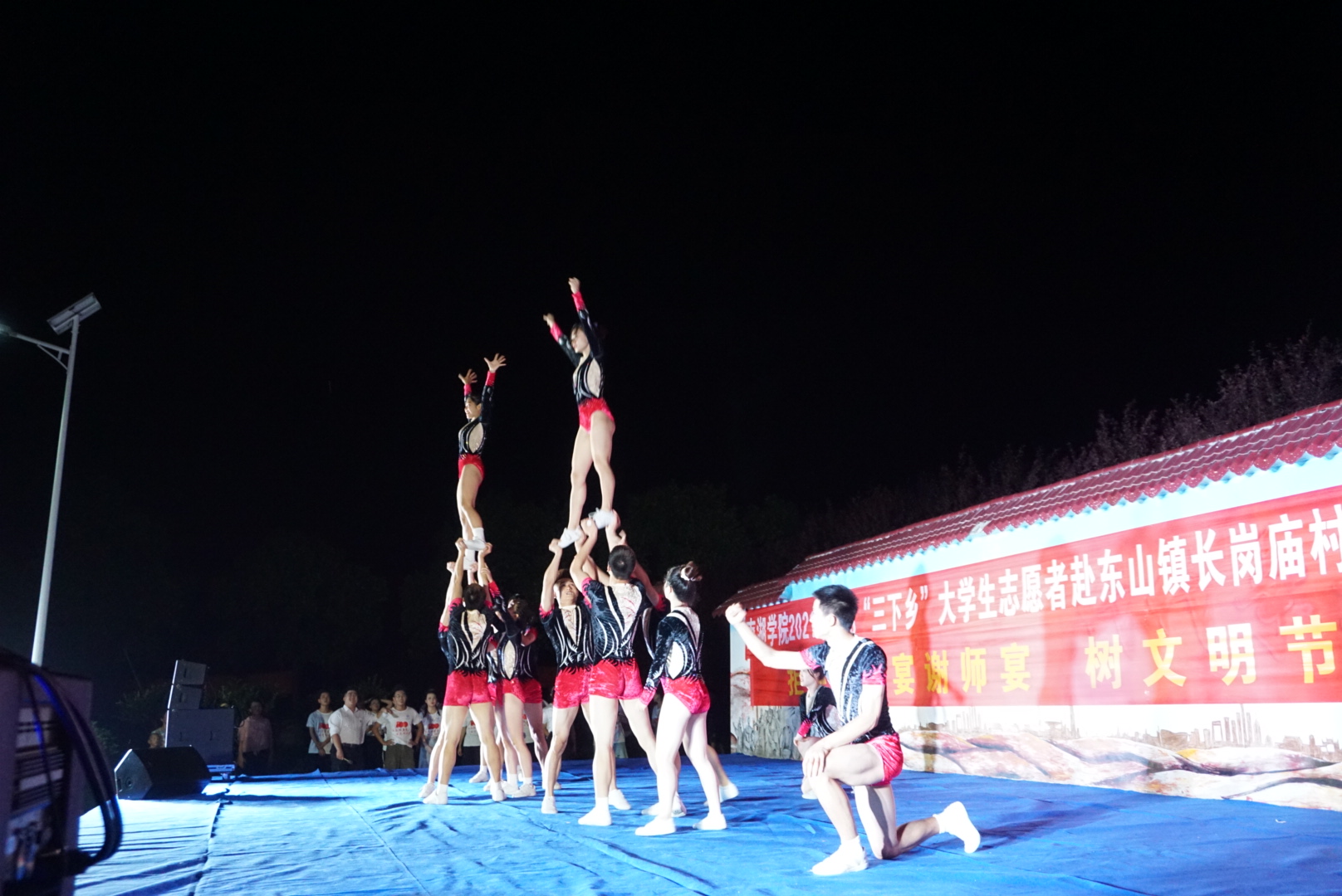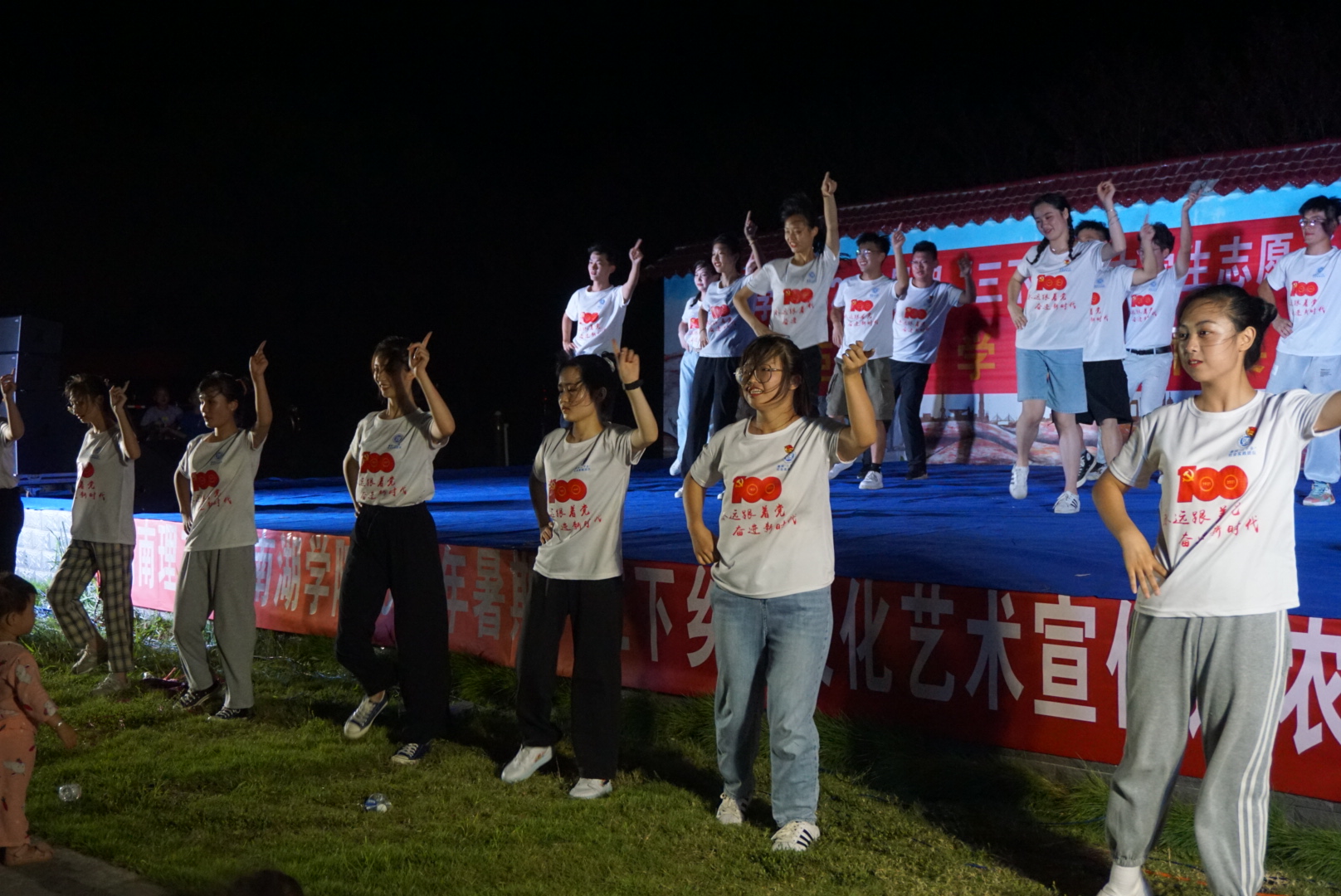 本次晚会由我院暑期“三下乡”社会实践第一团队与东山镇长岗庙村村民携手举办,共有11个节目,于7点半在大合唱《我和我的祖国》中拉开了序幕,婀娜多姿的古典舞《清平乐》、刚劲有力的《擒敌拳》、朝气蓬勃的《健美操》、歌曲独唱《我们》演绎了南湖学子的青春活力;长岗庙村村民自编自排的舞蹈《没有共产党就没有新中国》、《十送红军》向我们演绎了长岗庙村村民的幸福生活;时尚动感的《T台秀》、活力四射的爵士舞《好时光》赢得了观众们的阵阵掌声;慷慨激昂的朗诵《致敬!新时代最可爱的人》把本次晚会推向了高潮。
