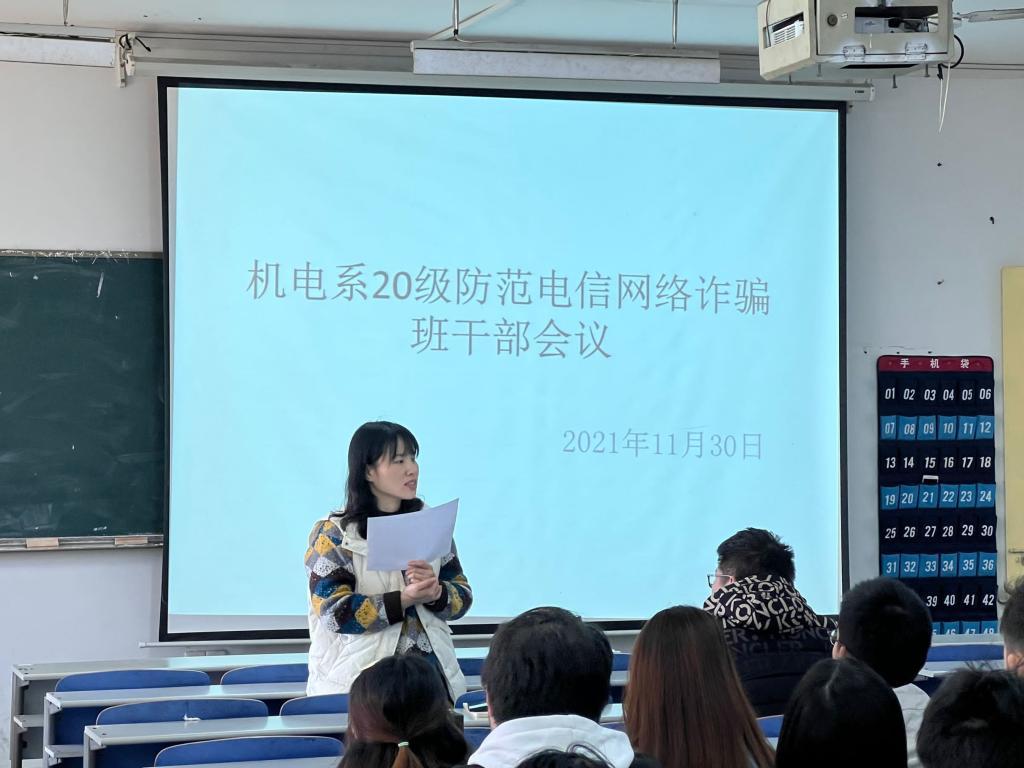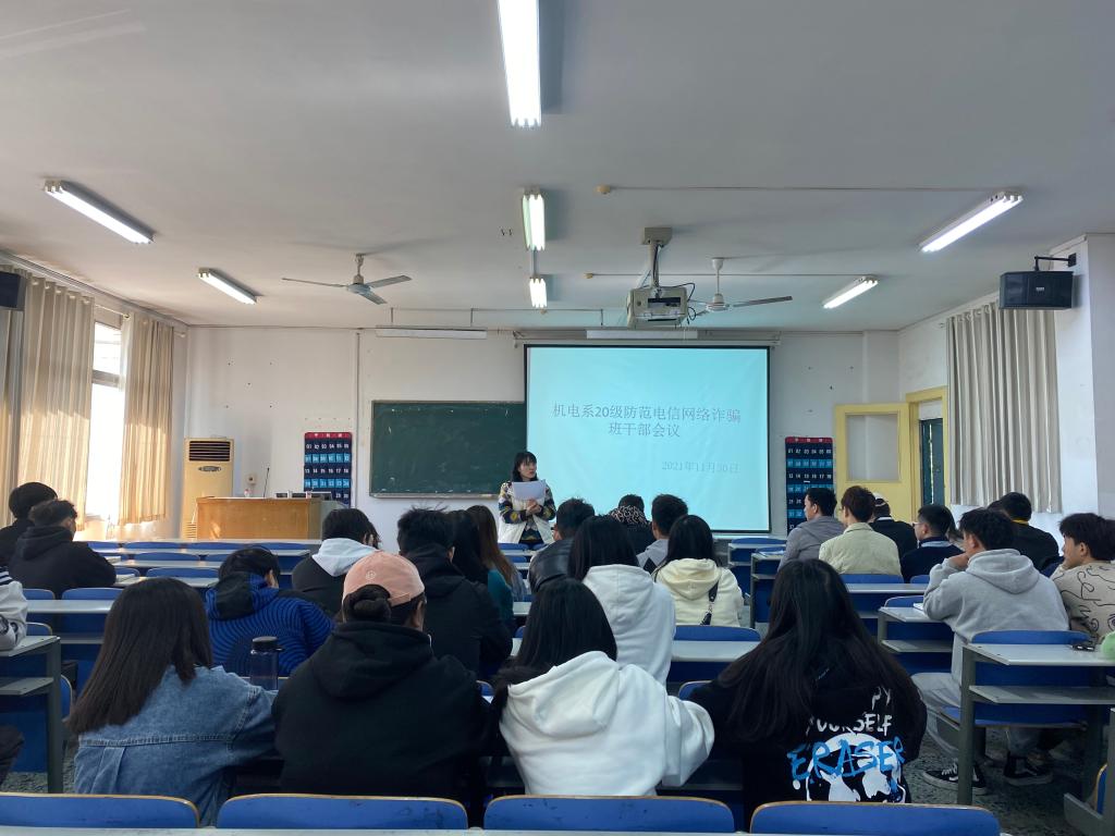 随着信息时代的发展,移动支付进入了我们的生活,但是网络诈骗也随之而来,开学以来的网络诈骗事故频发。为了避免此类事故的发生,机电系于2021年11月30日在文学楼2301教室开展20级班干部培训暨防范电信网络诈骗会议,20级各班班委参会,会议主讲人为20级辅导员刘芬芬。