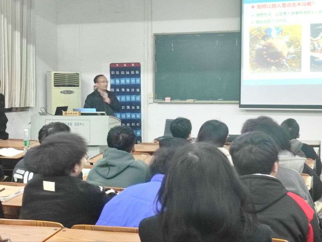 杨主任提到,互联网的广泛发展已经深深地影响到大学生的学习生活,很多大学生将大量的时间花费到网络游戏和虚拟社会中,对现实生活的热切度越来越小,沉迷于网络世界的同时也已经渐渐脱离现实生活,这些都严重影响到他们的人际交往和各项社会实践活动,而且一些不良的网络信息和不健康的文化正在逐渐侵蚀着大学生的思想,严重影响了大学生的身心健康。随后,李圣春教授讲解了网络带来危害的同时又在现场演示了不法分子是如何利用网络入侵目标主机,并且篡改盗取用户信息的,以此让在场的同学们都留下了深刻的印象,使他们深深地意识到了网络安全的重要性以及网络带来的危害与弊端。