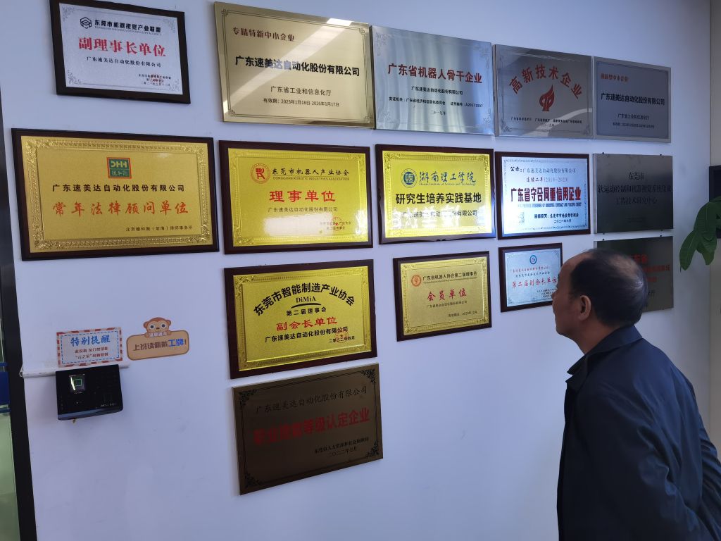 南湖学院一行人来到速美达的生产车间进行参观,详细了解了企业的发展情况与园区建设情况。公司负责人介绍广东速美达自动化股份有限公司成立于2004年08月16日,是一家从事自动化产线销售、自动化设备销售和自动化组件销售等业务的公司。企业的经营范围为:自动化产线、自动化设备、自动化组件、自动化生产系统集成、工业机器人及组件的研发、设计、生产和销售;自动化产品的维修、安装调试;自动化产品软件开发及技术咨询服务;技术转让;货物与技术的进出口。公司负责人表示,期待与学校不断加强在平台、教学、人才、项目等方面的合作,打造出校企合作的新样板,助推双方共同发展,协同共赢。