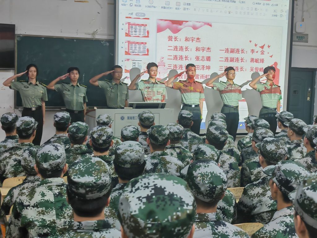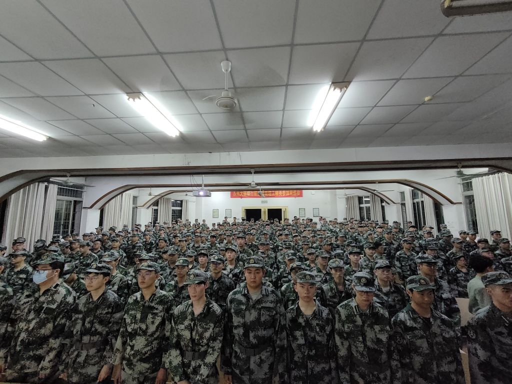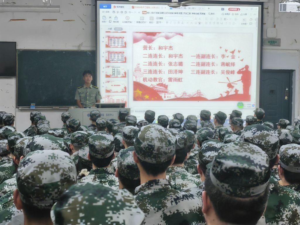 会议第三项,由教官依次上台进行自我介绍,营长和宇杰强调了军训期间的一些着装、内务、纪律要求,要新生们注意礼节礼貌等问题,并强调了第二天升国旗的时间和地点。