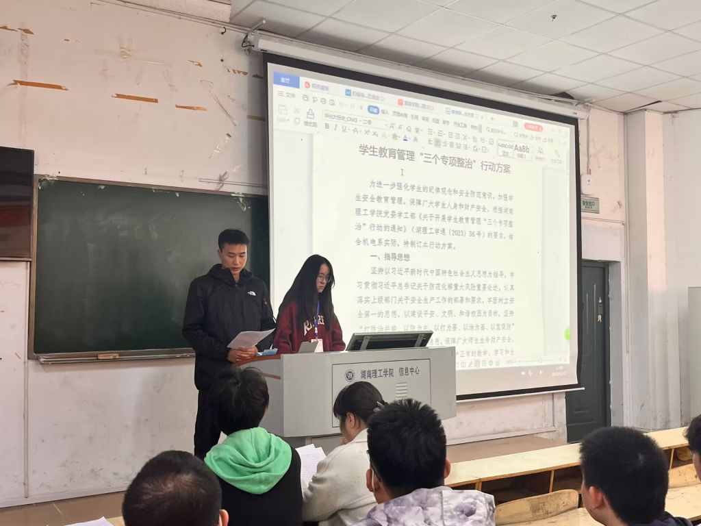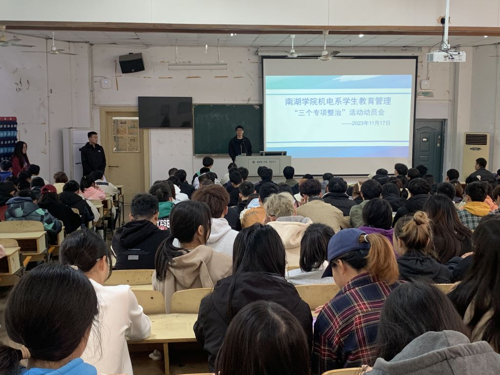 为进一步强化学生的纪律观念和安全防范意识,加强学生安全教育管理,保障广大学生人身和财产安全,贯彻落实湖南理工学院党委学工部《关于开展学生教育管理“三个专项整治”行动的通知》(湖理工学通〔2023〕36号)文件精神,2023年11月17日中午11:50,南湖学院机电系在2T2教室召开学生教育管理“三个专项整治”行动动员大会。参加本次会议的有机电系党总书记喻立平,机电系全体学工辅导员,2021-2023级全体班委,安信部干事,全体党员及预备党员们。此次会议由安信部长宁天屿主持。