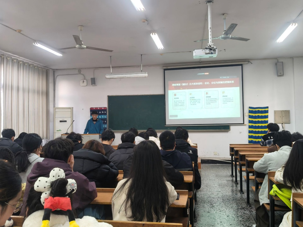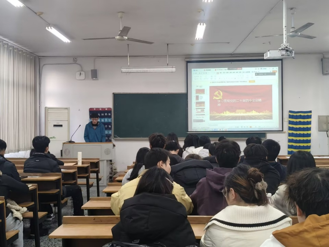 为深入学习贯彻党的二十届四中全会精神,引导青年学子深刻把握国家发展新阶段、新目标、新任务,切实把思想和行动统一到党中央决策部署上来,2025年12月5日,机电系学生党支部组织开展了“学习贯彻党的二十届四中全会精神”专题党课。本次党课由学生党员何志豪同志主讲,小组成员陈宇轩、李硕、郝芬芬、杨涛、曾梦、姚潇湘、陈缘,雷宇鑫,谭佳佳共同参与,除部分党员因考研或校外实习参加线上党课学习,其余全部党员均到场参与学习。