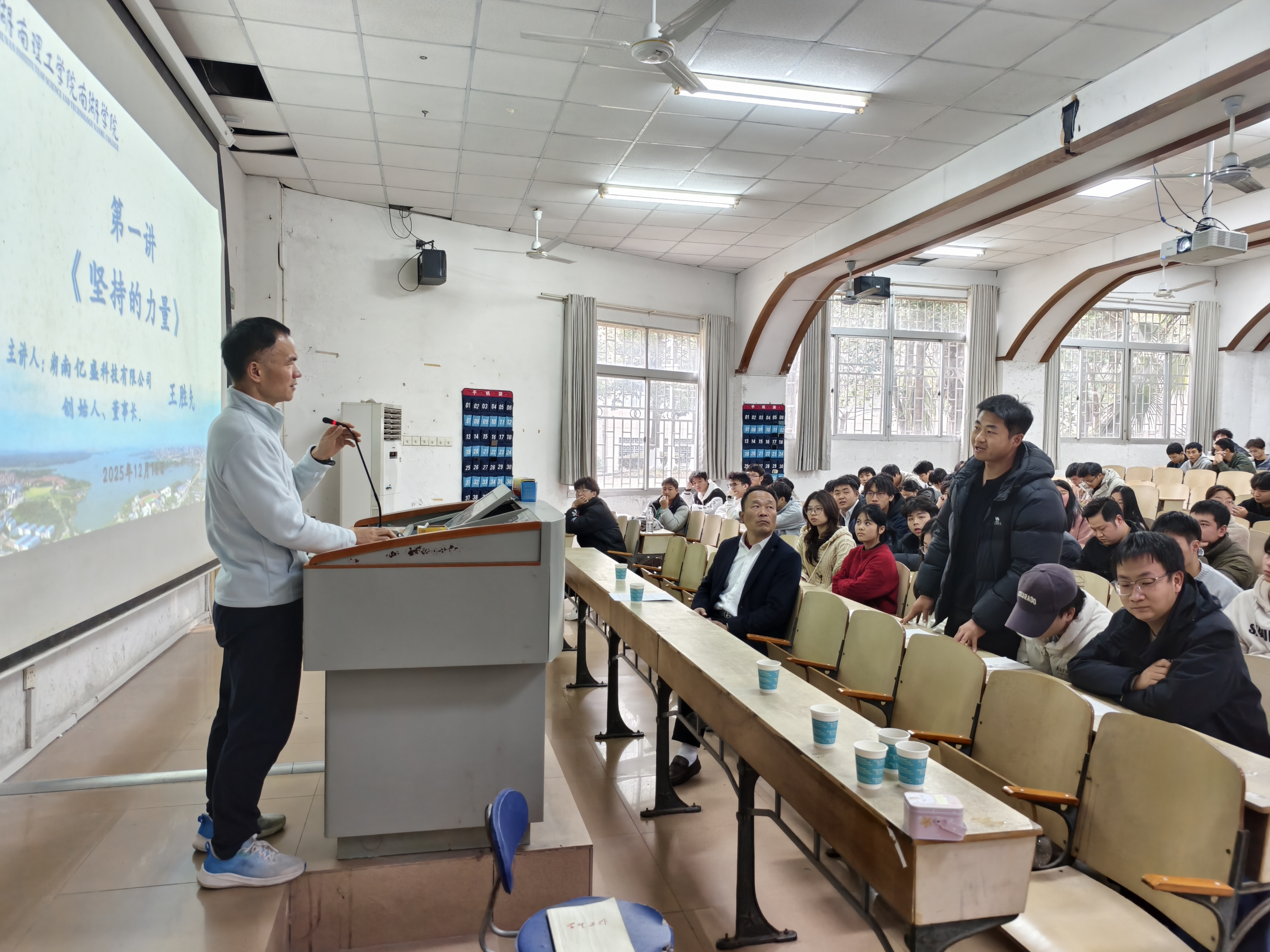 2025年12月16日下午,南湖学院机电系学生干部培训班首场专题讲座在2T1教室顺利开讲。本次讲座以《坚持的力量》为主题,机电系特邀湖南亿盛科技有限公司创始人、董事长王胜先先生主讲,机电系党总支副书记刘芬芬老师主持。主讲人王胜先结合自身创业历程与马拉松运动,为在场学生干部带来了一场内涵丰富的精神盛宴,强调持之以恒、奋斗不止的信念对个人成长的深远影响。