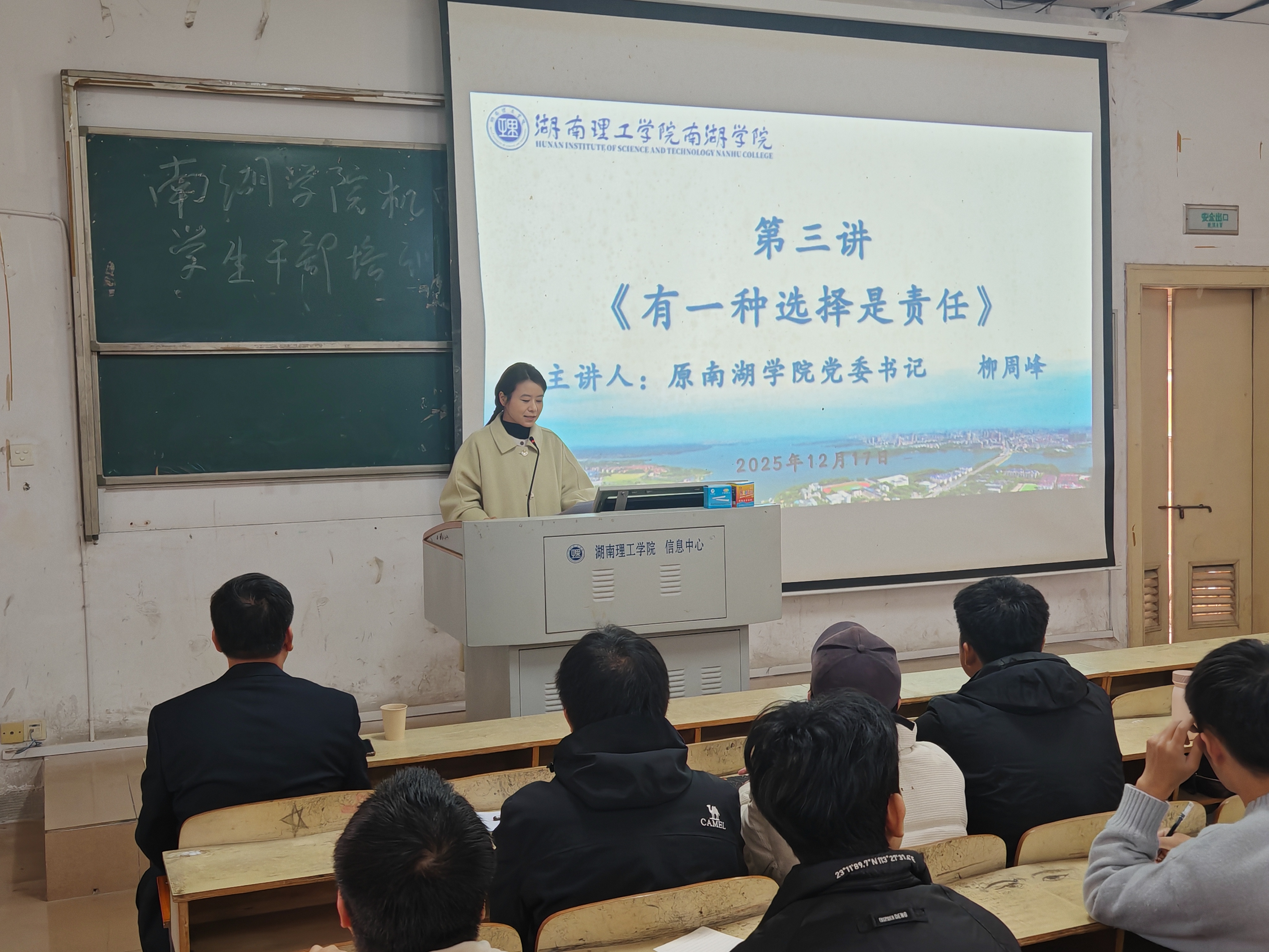 2025年12月17日下午2点,南湖学院机电系学生干部培训班第三讲在2T1教室开讲。原南湖学院党委书记柳周峰老师以《有一种选择是责任》为题,以责任为名,为在座学生干部带来了一场关于责任、信仰、履职与成长的深度讲座。本次培训由学生第一党支部书记、23级辅导员王紫梦老师主持,机电系各级学生干部齐聚一堂,聆听前辈教诲,汲取成长力量。