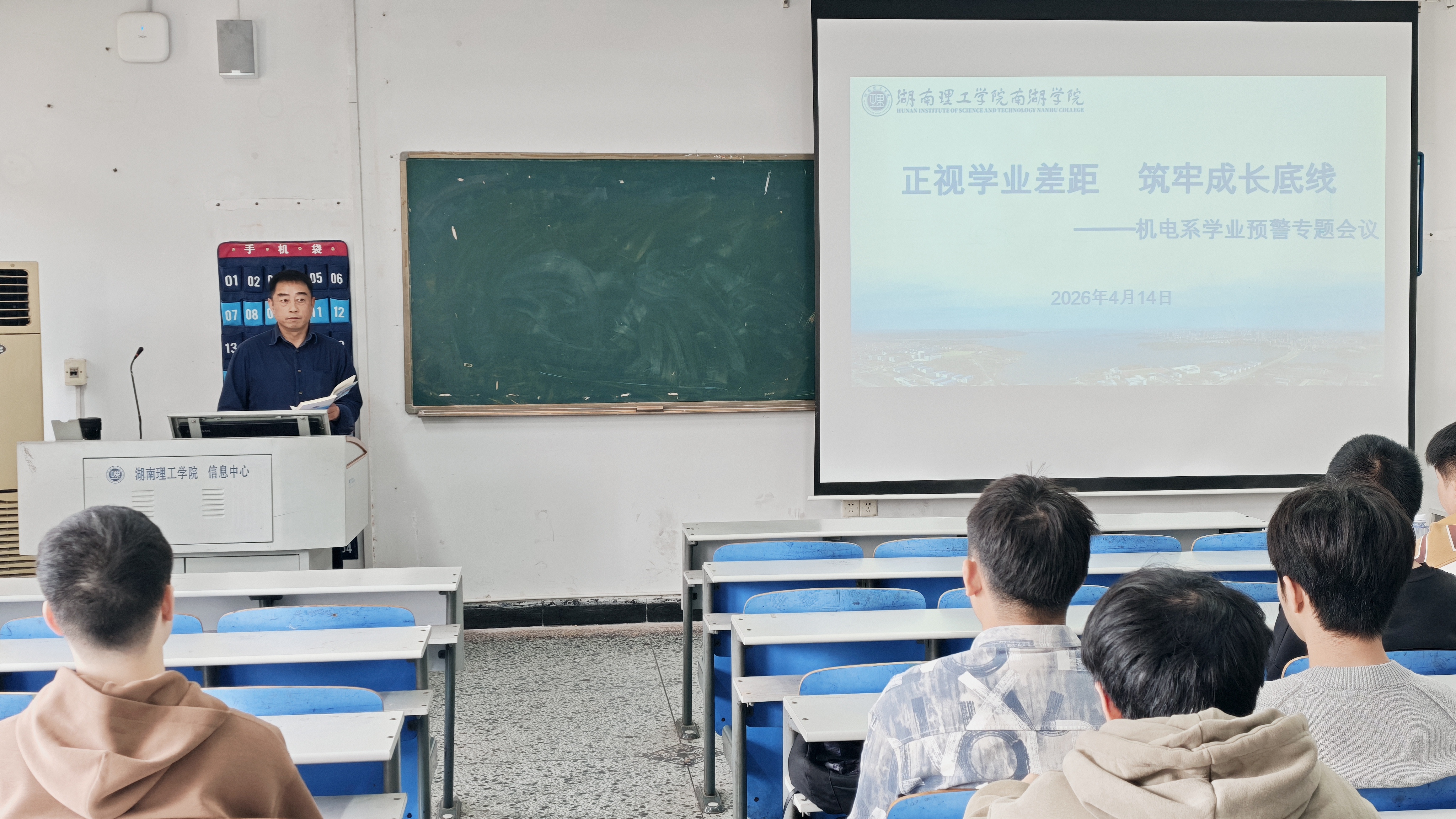 为进一步加强学风建设,规范学生学业管理,切实防范化解学业问题,引导学生端正学习态度、明确奋斗目标,2026年4月14日下午,南湖学院机电系于二号教学楼2301教室组织开展“正视学业差距,筑牢成长底线”学业预警专题座谈会。本次会议由南湖学院副院长兼机电系主任蔡安辉主讲,毕业年级辅导员彭添宝和相关学业预警学生参会。