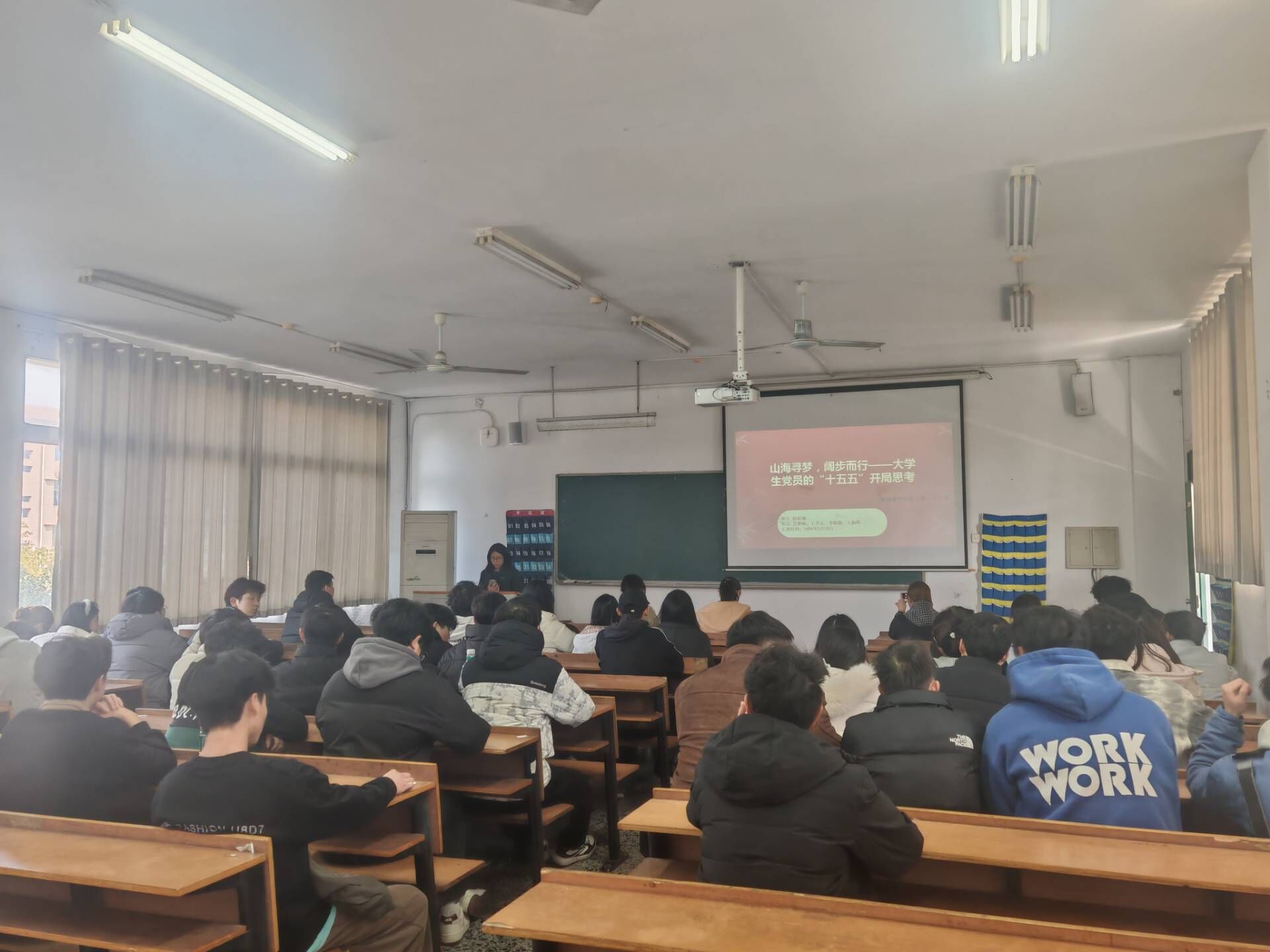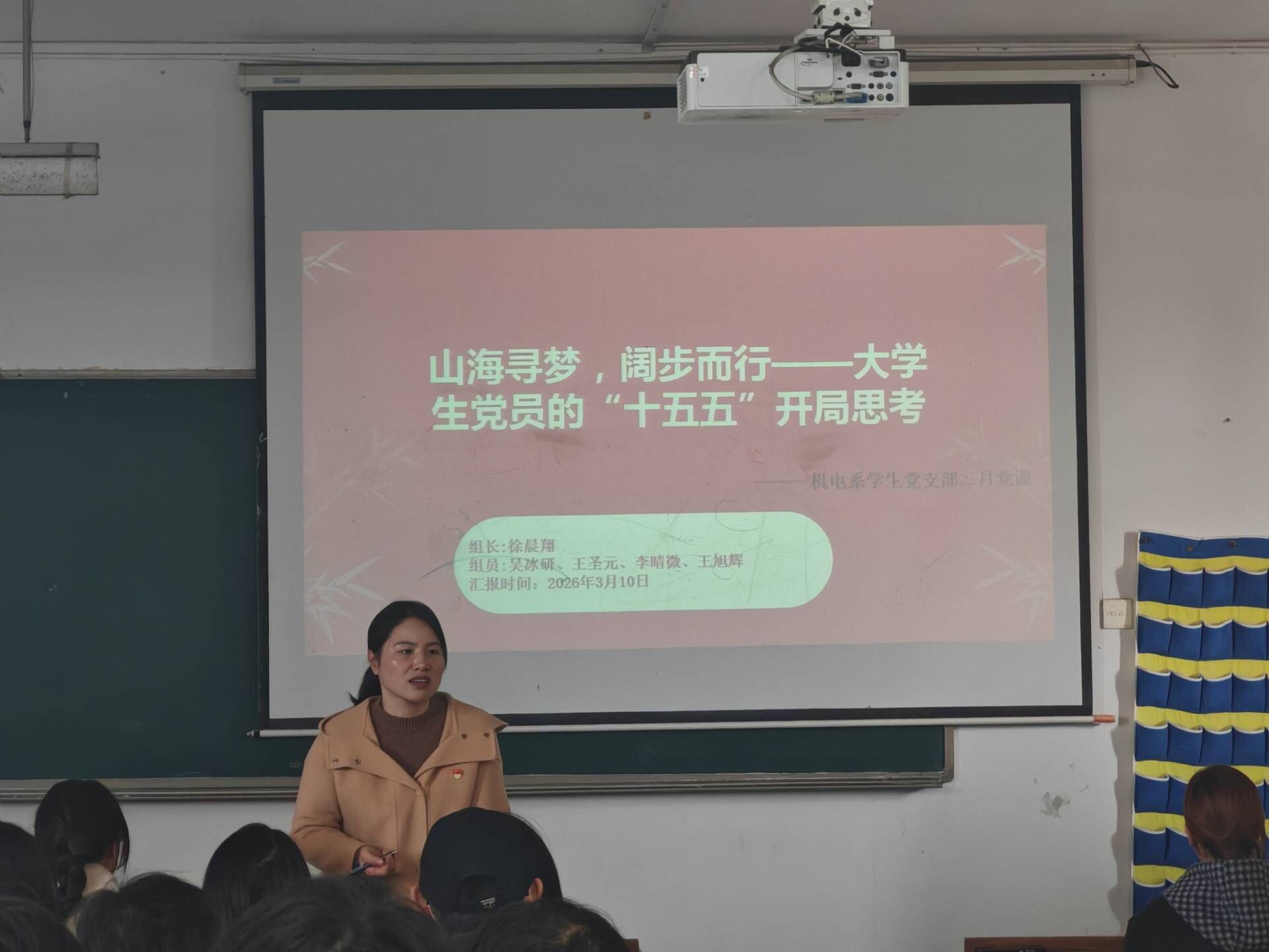为深入学习贯彻“十五五”规划精神,引导大学生党员将个人成长与国家发展同频共振,2026年3月10日下午14:00,机电系学生党支部于2311教室开展二月份“山海寻梦,阔步而行——大学生党员的‘十五五’开局思考”主题党课。全体学生党员采用线上线下相结合的模式共同参加本次党课,系组织部工作人员现场完成签到工作,确保党课参与率,保障学习成效。