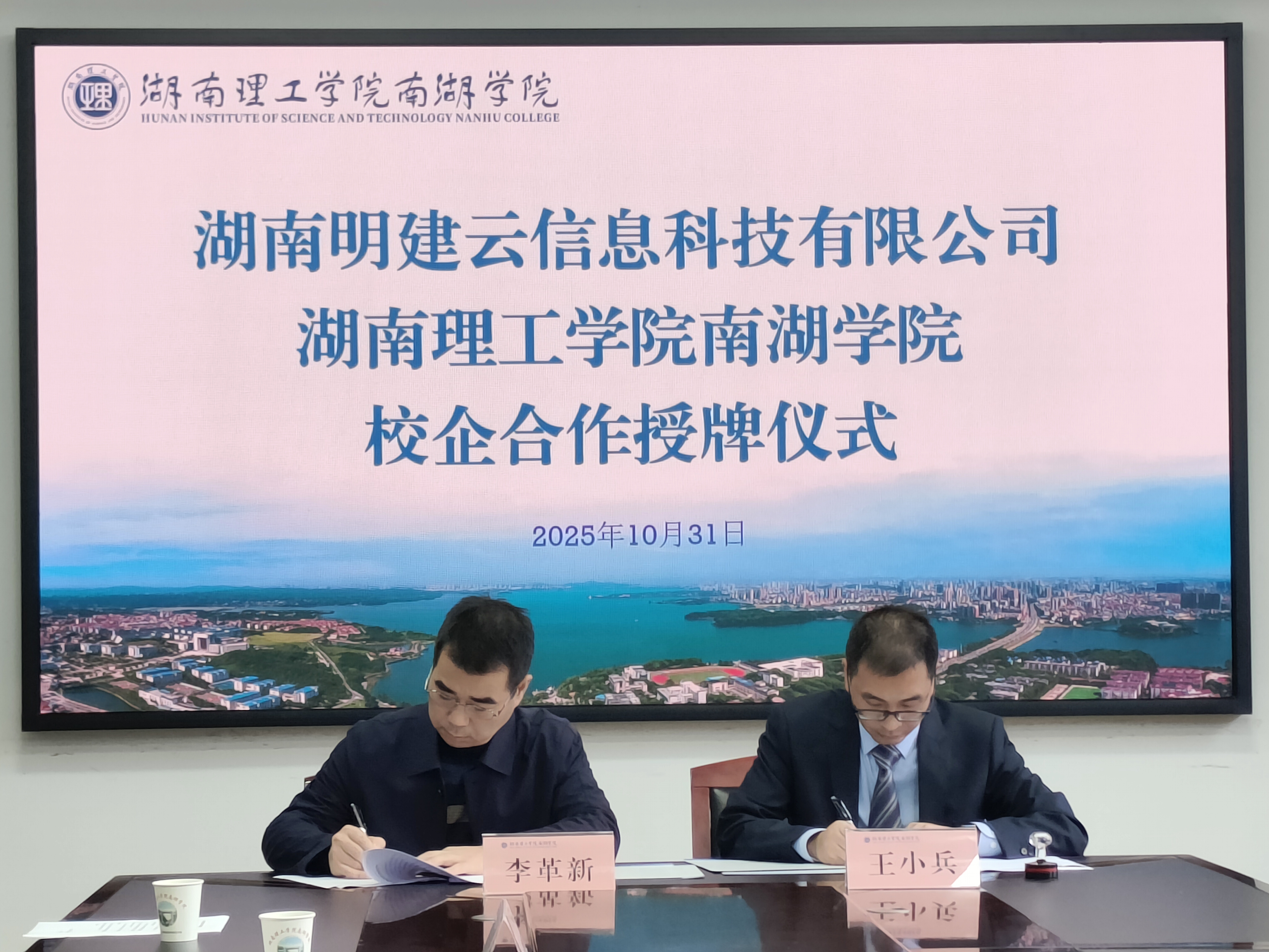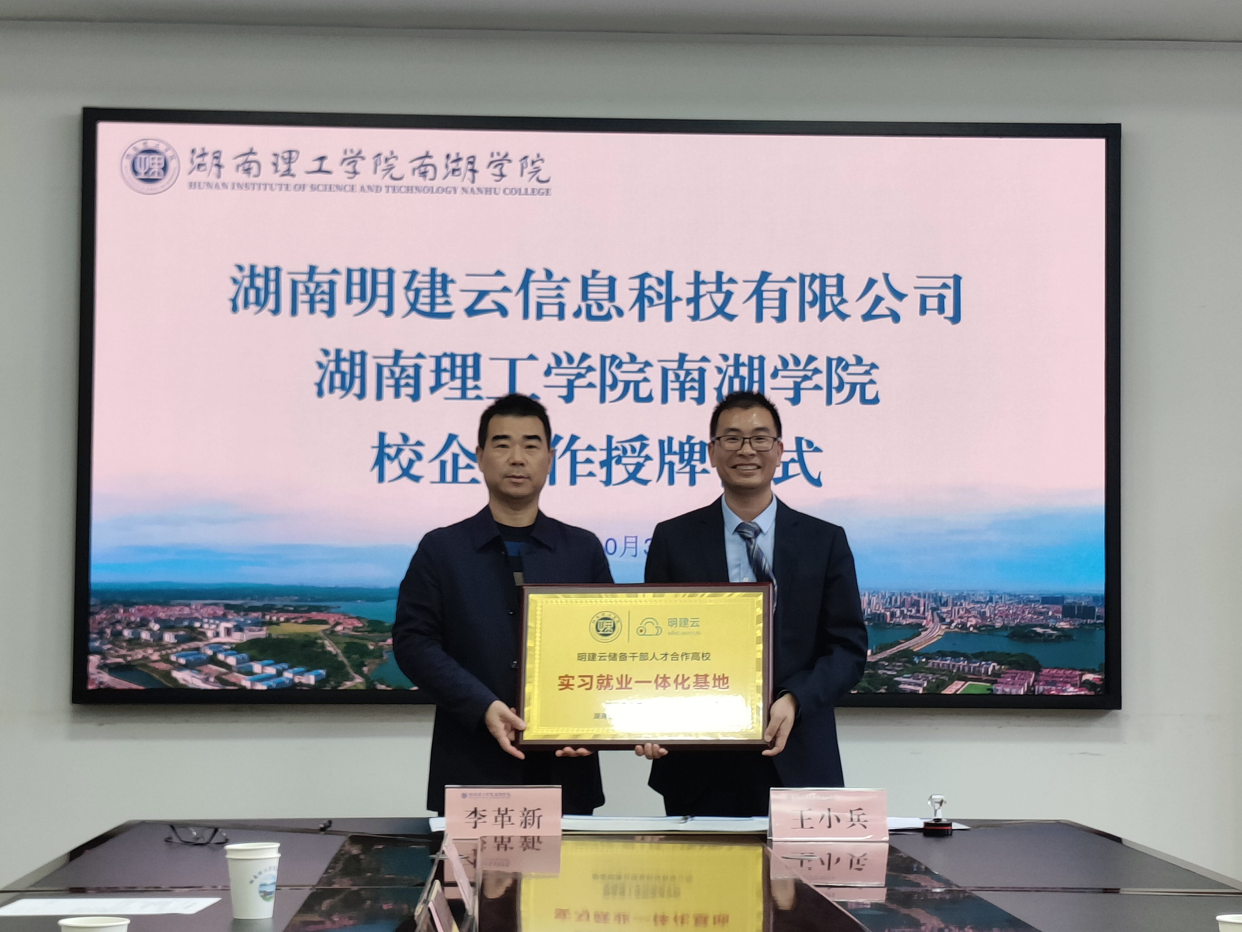 为深化产教融合,打通学生从校园到职场的“最后一公里”,10月31日,湖南理工学院、湖南理工学院南湖学院分别与湖南明建云信息科技有限公司(以下简称“明建云”)隆重举行实习就业一体化基地签约暨挂牌仪式。此次合作标志着校企双方在协同育人方面迈出了坚实一步,为湖理学子搭建起一座直通优质岗位的桥梁。